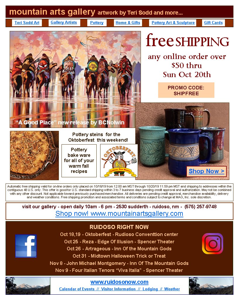 thru Sun Oct 20thPROMO CODE: SHIPFREEvisit our gallery - open daily 10am - 6