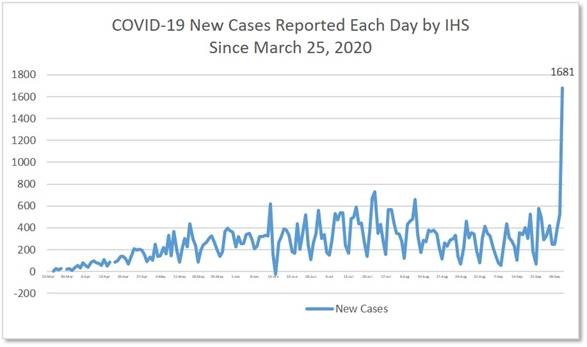 According to updates published on the Indian Health Service (IHS) coronavirus website, total COVID-19 cases and new COVID-19 cases per day continue to increase in the Indian health system. Cases also continue to increase in all IHS Areas, some more than others. The new cases per day trend also has a large increase today, and is concerning if this is a continuing trend given the recent increasing trends in many states. The virus is still out there and still very contagious. Mitigation efforts need to continue until there is an effective treatment or vaccine.