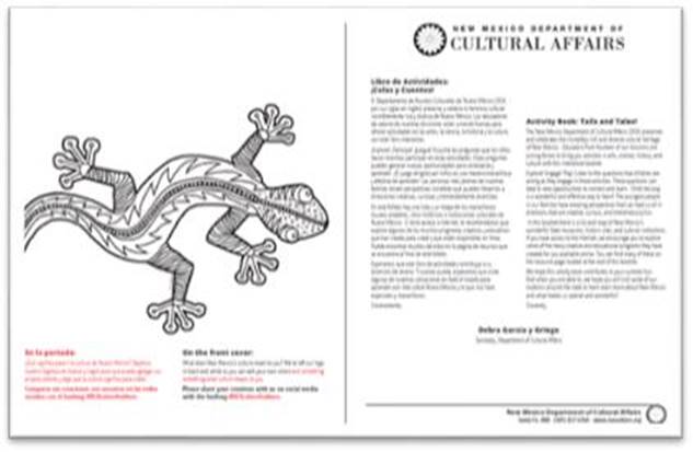 I am happy to tell you that the State Library is sponsoring the printing of a new 48 page coloring/activity book from the Department of Cultural Affairs with a Tails and Tales/Colas y Cuentos theme (sneak peek below). We will be shipping them to all of the public and tribal libraries (quantity based on your population) in approximately 2 weeks. A pdf version will also be freely available if you want to print more copies, or print specific pages.