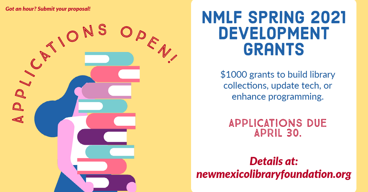 The New Mexico Library Foundation (NMLF) is pleased to announce that the Spring 2021 Development Grant cycle is open. The deadline for applications is April 30, 2021.
