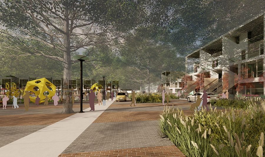 image: a green street in the "Markham Square Housing District" project that incorporates bioswales, which help treat stormwater runoff. Rendering courtesy of the U of A Community Design Center