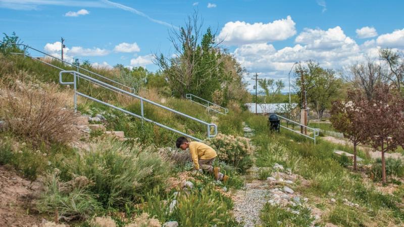 The garden is located behind the Española City Hall, on the slope leading down to Valdez Park. Parking is available at the Española Public Library/Lucero Center lot, or on Vietnam Veterans Memorial Road adjacent to the park.
