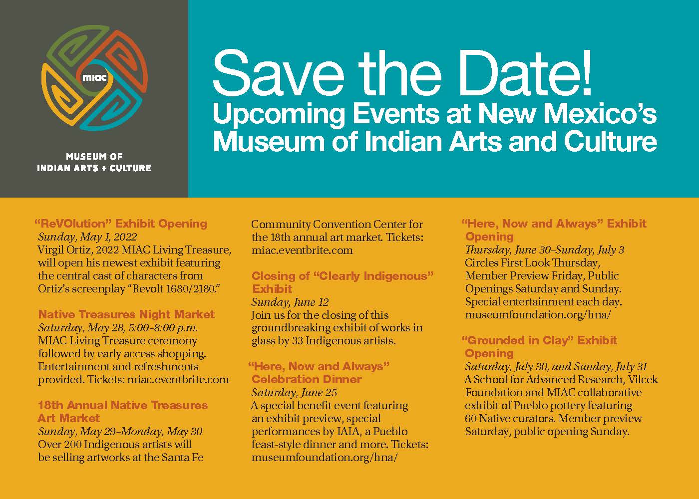 See the attached image for upcoming events at MIAC (Museum of Indian Arts & Culture) in Santa Fe.