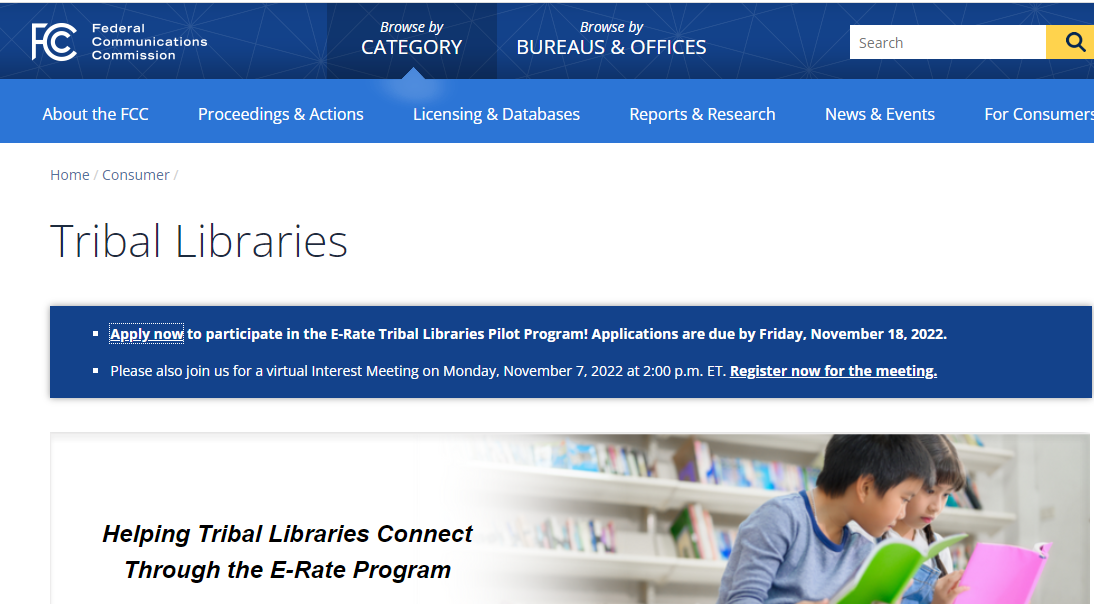 E-Rate Tribal Libraries Pilot Program applications due November 18, 2022. To learn more, click here for the FCC website.<https://www.fcc.gov/tribal-libraries> Please note the dark blue box for Apply now and the virtual Interest Meeting on Monday, November 7, 2022.