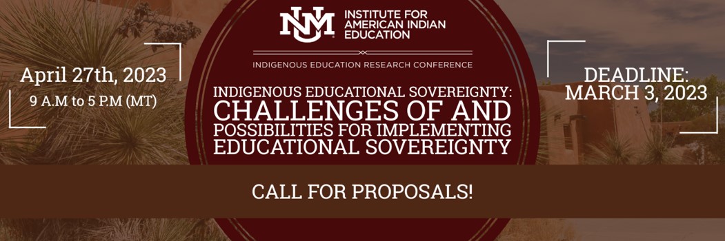It is a pleasure to announce a call for proposals for the 7th Annual Indigenous Education Research Conference. The conference is hosted by the University of New Mexico’s Institute for American Indian Education.<https://iaie.unm.edu/index.html> The in-person conference will take place on April 27, 2023 from 9 A.M. to 5 P.M (MT) at the Indian Pueblo Cultural Center in Albuquerque, New Mexico.