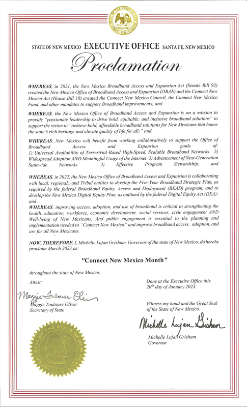 On February 15, 2023, during New Mexico Broadband Day at the Roundhouse, Governor Michelle Lujan Grisham announced the official Executive Office Proclamation declaring March 2023 as "Connect New Mexico Month." Read the proclamation, click here<https://r20.rs6.net/tn.jsp?f=001Y4v_-hwvhOaycJiT7xtefI6fI5RT126J2WDO7JEzTqOwAdEEAtj1ayc8BlENHdmMtnq7u70s-fsjS5ku-zAc76JUBqEONQZe6lztvn9PUFA6wyBZjainboLv7ZnEB_e7YuLD0ufQZ2Uu5BM7t12E8exvHoqLsT6ZYQd_C-P2Ge4SOE2prNrY62w1ycDM8DWTrvwQEsojSYuUHjUznNNDqO_EY5k67gOTNX7MSUIz-pc=&c=4BYgXiAfDqN3lCTm_J3_WmOzlD04-ysIEhdQIuN9aG9eKo7gnlru9Q==&ch=hz5h58RxSFDZ2UIJd9wkMNbYBh0nuBYW8L-QDJwRlUGS5qKICeCTGA==>.