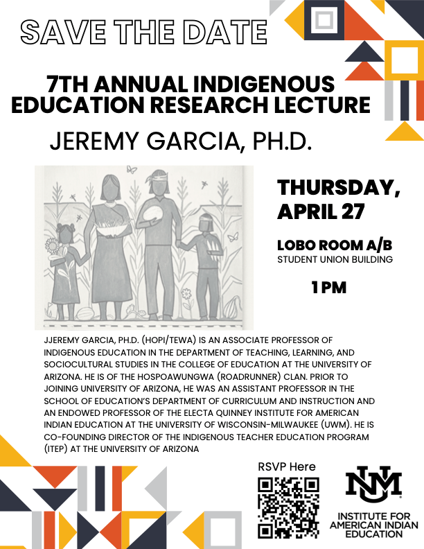 We are excited to announce the 7th Annual Indigenous Education Research Lecture hosted by the Institute for American Indian Education (IAIE). This year's lecture will be delivered by Jeramy Garcia, Ph.D. (Hopi/Tewa), who is an Associate Professor of Indigenous Education at the University of Arizona.
