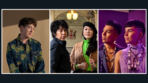 Youth in Action: Wearing Our PRIDE. From left to right: Christian Allaire (Ojibwe) moderates the conversation between Alex Manitopyes (Cree/Anishinaabe), Angel Aubichon (Cree/Métis), Adrian Stevens (Northern Ute/Shoshone-Bannock/San Carlos Apache), and Sean Snyder (Navajo/Southern Ute). Christian Allaire photo: Courtesy of Christina Ciddio Sean and Adrian photo credit: Courtesy of Adrian Stevens