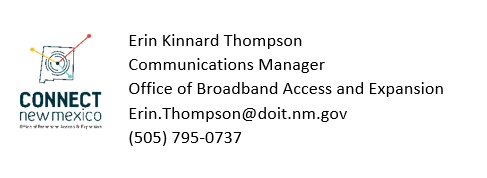 Finally, please save the date May 24 for a statewide “Internet for All” summit hosted by OBAE in coordination with the National Telecommunications and Information Administration. The event at Buffalo Thunder in Santa Fe will include state and local officials and is a chance to learn about the latest in funding opportunities and broadband initiatives. To stay up to date about the event and register to attend, you can find more information<https://connect.nm.gov/statewide-summit.html> on our website.