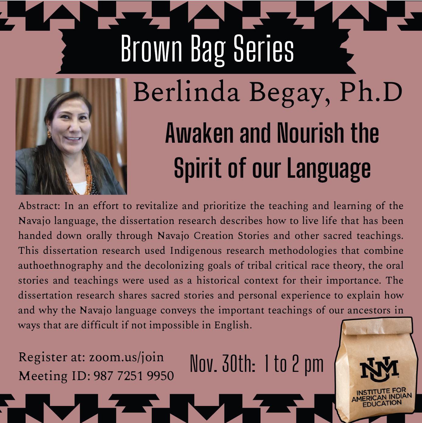 On Thursday, November 30, 2023 the brown bag series will feature Dr. Berlinda Begay (Diné). Berlinda Begay is a citizen of the Navajo Nation. She lives in a small rural community called Red Mesa, AZ but was raised in another small rural community called Rock Point, AZ. Berlinda has been in Indian Education for over 27 years, but her passion is working with Navajo language and culture. Today, Berlinda's work is focused on Indigenous language revitalization, reclamation, preservation, and advocacy for cultural identity in many facets such as culturally responsive teaching. Navajo is her first language. Her undergraduate and graduate degrees were specific to Navajo bilingual bicultural education, and administration specific to working for Navajo children, and Navajo people. Berlinda credits her humble upbringing as the inspiration for what she does today in Navajo language and culture; “I do what I do because of my own children, my Navajo children, and for the unborn. My upbringing has a lot to do with what inspires me to do this work. I believe that it is my purpose in my life to do the work that I do.”