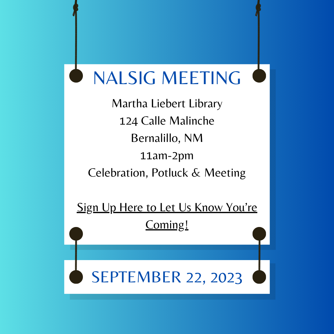 Our next NALSIG meeting will take place on Friday, September 22, from 1130am-2pm, at the Martha Liebert Public Library in Bernalillo. This will be a celebration and potluck, as well as meeting. The following link will take you to a spreadsheet to add your name if you are planning on attending, as well as what you will bring to the table!