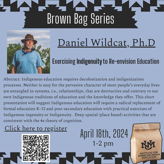 On Thursday, April 18, 2024 the brown bag series will feature Dr. Daniel Wildcat, Ph.D.
