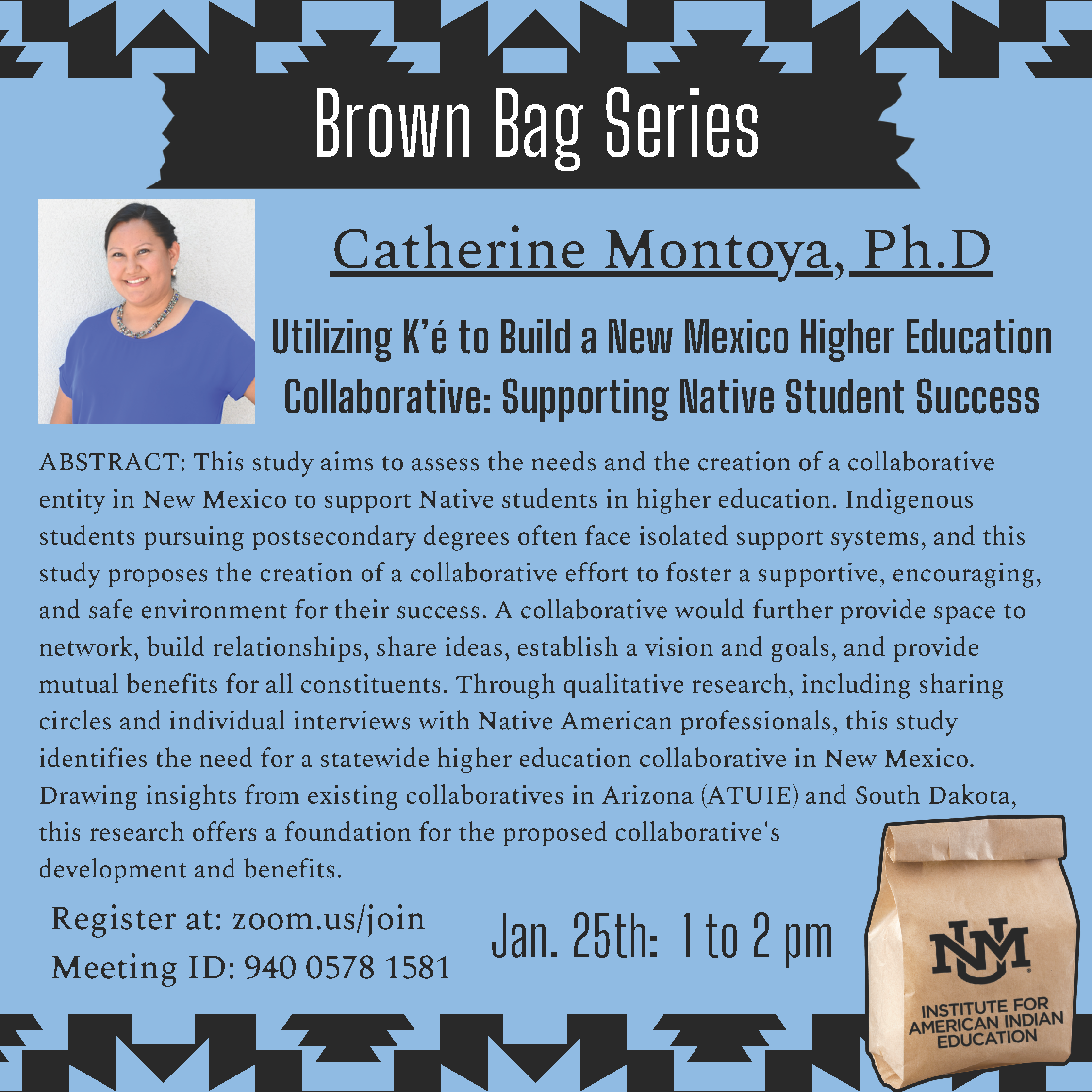 On Thursday, January 25, 2024 the brown bag series will feature Dr. Catherine Montoya. Dr. Montoya (Diné) is Dibé Łizhiní (Blacksheep) clan, born for Táchii’nii (Red Running Into The Water) clan, her maternal grandfather's clan is Haltsooí (Meadow People) and her paternal grandfather's clan is TŁ'ááschí'í (Red Bottom). She is from Tse'Da Tah Canyon near Lupton, Arizona on the Navajo Nation. Her husband, James Montoya, is from Katishtya (San Felipe Pueblo) and Isleta Pueblo.