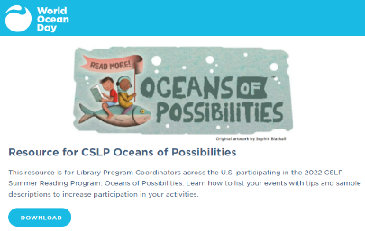 WorldOceanDay.org<https://gcc02.safelinks.protection.outlook.com/?url=https%3A%2F%2Fworldoceanday.org%2F&data=05%7C01%7CCarmelita.Aragon%40state.nm.us%7C36d36e171c3643cb4bce08da43245912%7C04aa6bf4d436426fbfa404b7a70e60ff%7C0%7C0%7C637896120649619789%7CUnknown%7CTWFpbGZsb3d8eyJWIjoiMC4wLjAwMDAiLCJQIjoiV2luMzIiLCJBTiI6Ik1haWwiLCJXVCI6Mn0%3D%7C3000%7C%7C%7C&sdata=2j4Jo0KXlXfv32W3Zx0GJTK5vdpIix3gYU4FYMjuuhw%3D&reserved=0> enthusiastically partners with CSLP and the 2022 Oceans of Possibilities Summer Reading program. We encourage everyone organizing activities for the CSLP program to list their activities on the WorldOceanDay.org site<https://gcc02.safelinks.protection.outlook.com/?url=https%3A%2F%2Fworldoceanday.org%2F&data=05%7C01%7CCarmelita.Aragon%40state.nm.us%7C36d36e171c3643cb4bce08da43245912%7C04aa6bf4d436426fbfa404b7a70e60ff%7C0%7C0%7C637896120649619789%7CUnknown%7CTWFpbGZsb3d8eyJWIjoiMC4wLjAwMDAiLCJQIjoiV2luMzIiLCJBTiI6Ik1haWwiLCJXVCI6Mn0%3D%7C3000%7C%7C%7C&sdata=2j4Jo0KXlXfv32W3Zx0GJTK5vdpIix3gYU4FYMjuuhw%3D&reserved=0> so you can reach more community members!