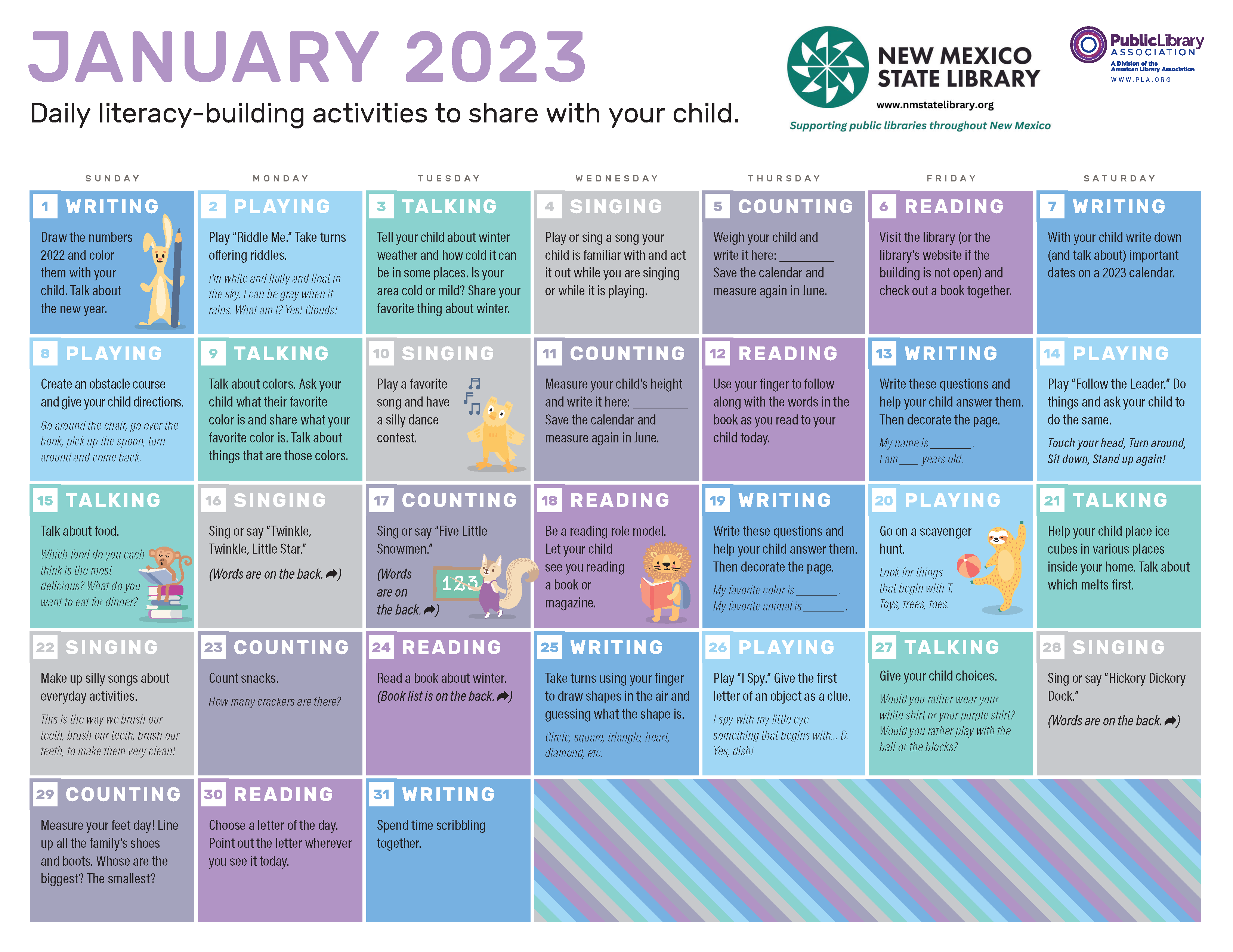 At January's meeting we'll be showcasing a new resource available to all our public libraries - an Early Literacy Calendar that can be shared out to your patrons or placed on your website or Facebook page. We'll show you how to access the English and Spanish versions for each month.