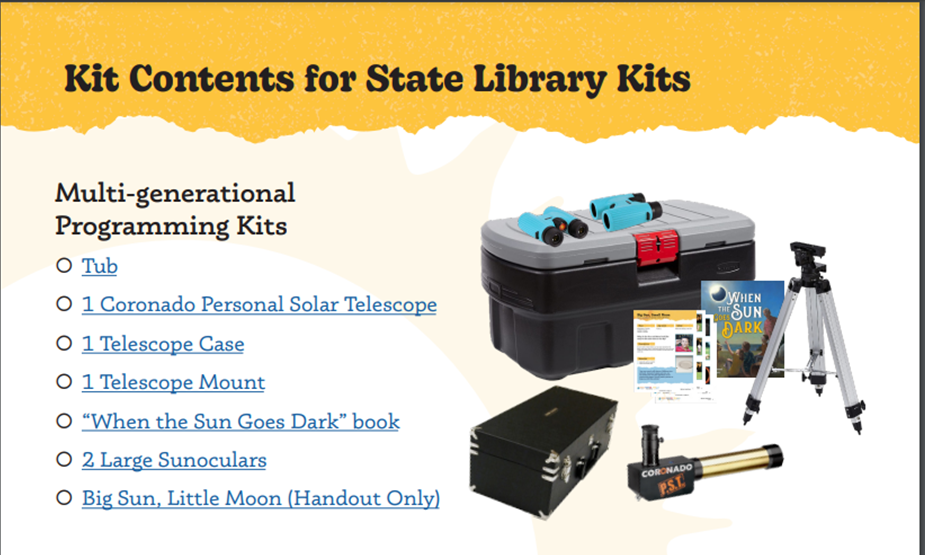The SOLAR KITS are here! NMSL has 4 solar science kits that will be available to circulate to public libraries - with solar telescopes and sunspotters, and all needed materials for activities. You can learn all about the kits and how to use them at the Solar Science workshop in Santa Fe on April 4th. Click here for full details and to register<https://docs.google.com/presentation/d/e/2PACX-1vQOsdm10oqg7HKx6kL-bAB2VMIjD41-crCnbhpDm8NaD43IRDfImJv949r-vkruKKNXLhrN5RuWR16n/pub?start=false&loop=false&delayms=3000&slide=id.p>. We'll be getting the kits ready for circulation - watch for details. (We have 2 each of a Multi-generational Programming and a Younger Audience Kit, and we'll have one of each at the Santa Fe workshop.)